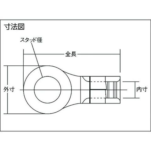・電線抱合範囲 単線(mm):2.9~3.6・外径寸法(mm):12・スタッド径(mm):5.3・全長(mm):23.5・内寸(mm):4.5・電線抱合範囲 ニクロム・ニッケル単線(mm):2.9~3.6・JIS規格品:×・色:シルバー・パック入数(個):100