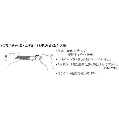 ・柄の差し込み口がネジになっています。ヤスリを回しながら固定して下さい。・平、半丸のヤスリに装着可能です。