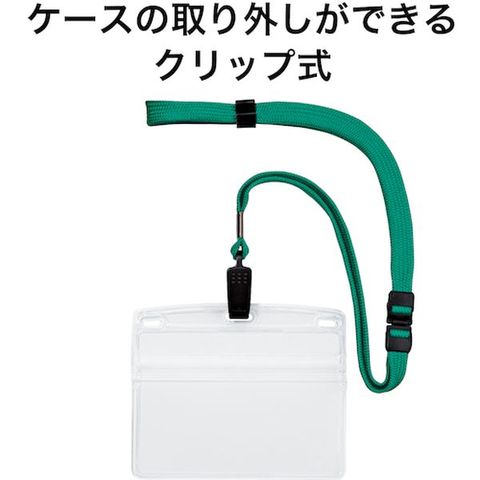 ・クリップ式でポケットに差し込めます。・名札ケースは、水やホコリが入りにくいチャック式です。・ストラップは取り外し可能です。・ストラップを強く引っ張ると安全装置が働き、事故を防止します。