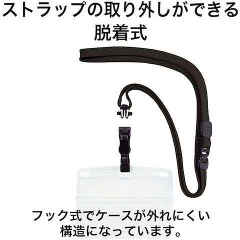 ・脱着式のため、タッグ名札としても使用可能です。・名札ケースは、水やホコリが入りにくいチャック式です。・クリップ付きなのでポケットに固定可能です。・両側のボタンを外すとひもが外れ、タッグ名札としても使用可能です。・取り付け・取り外しが簡単で外れにくいフック式です。・ストラップを強く引っ張ると安全装置が働き、事故を防止します。