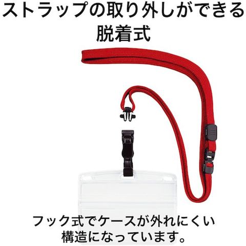 ・脱着式のため、タッグ名札としても使用可能です。・名札ケースは、水やホコリが入りにくいチャック式です。・クリップ付きなのでポケットに固定可能です。・両側のボタンを外すとひもが外れ、タッグ名札としても使用可能です。・取り付け・取り外しが簡単で外れにくいフック式です。・ストラップを強く引っ張ると安全装置が働き、事故を防止します。