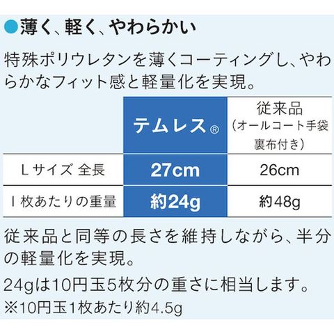 ・汗などの湿気を手袋外部に放出することでムレを軽減する、ポリウレタン作業用手袋。・特殊ポリウレタンコーティングで、防水手袋なのに透湿性があり、ムレを軽減。・ポリウレタン製で、天然ゴム手袋に比べて軽く柔らかい。軽量で疲れにくい作業手袋。・特殊樹脂コーティングで高い滑り止め効果を発揮。・掃除や洗車等水回り作業の他、自転車やロードバイクのメンテナンス等、幅広く使えるグローブ。