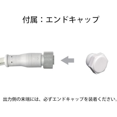 ・出力側末端には必ずエンドキャップを装着してください。・定格電圧、電源電圧、電源周波数の区分を必ず確認してご使用ください。・当社の製品以外との連結はしないでください。・本品は切断出来ません。途中で切っての使用はしないでください。・防滴仕様(防水仕様では無い)の為、水に浸けるなどの水中施工は出来ません。