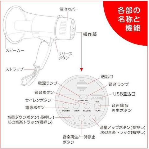 ・スタイリッシなトランスルーセントボディに、小型・軽量でわかりやすい操作感です。・店頭や駐車場、イベント会場や避難訓練などでのご案内に役立つメガホン型の拡声器です。・USBメモリを挿入し、保存されている音楽や音声のMP3データを再生できます。・サイレンボタンを押すとサイレンが鳴り、もう一度押すことで停止します。・サイレン中も音声の再生は有効です。・1回につき約4分までの録音機能を搭載しています。・再度録音すると以前の録音は削除されます。