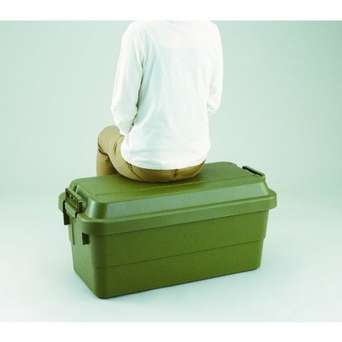 ・多目的収納ボックスです。・フタが頑丈な造りのため、人が腰かけても安心です。・耐荷重100kgです。・持ち手が付いているので、持ち運びしやすいです。・同サイズのフラット天板タイプとも積み重ね可能です。・耐荷重100kgなので、防災用品収納などにも使用できます。