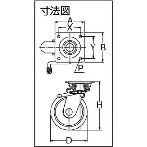 ・車輪径D(mm):100・タイプ:自在式(ストッパー付)・許容荷重(daN):176・許容荷重(kgf):180・車輪幅(mm):32・取付高H(mm):144・取付座A(mm):95・取付座B(mm):95・取付ピッチX(mm):68.0~73・取付ピッチY(mm):68.0~73・取付穴径P(mm):10.5・許容荷重(N):1800