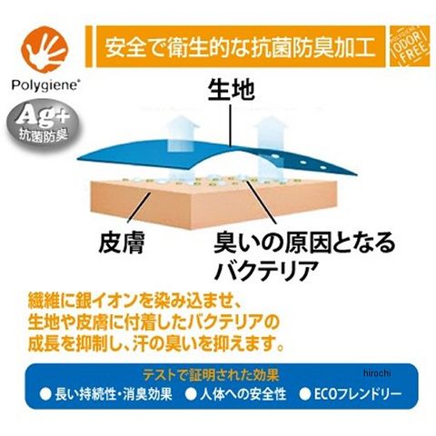 表地に銀イオンを吸着させてあるので、抗菌作用によりバクテリアの繁殖を抑制し、消臭効果を発揮します。裏地は吸湿性の高い素材で、ヘルメット内の湿気を素早く吸い上げます。