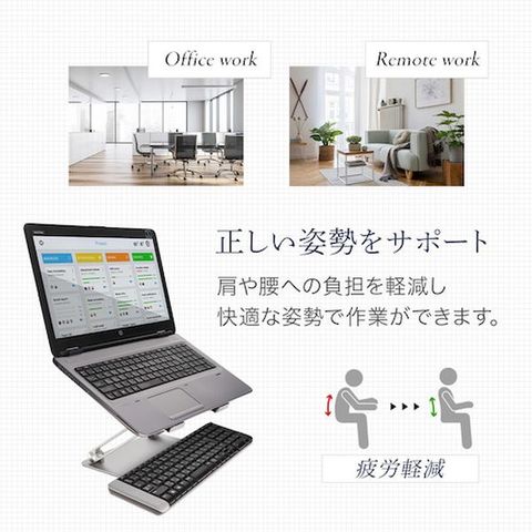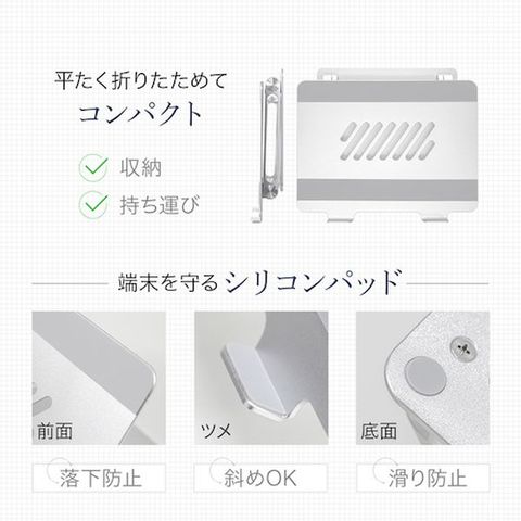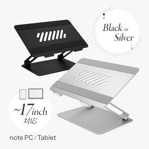 ・シンプルなデザインながら高級感のあるアルミ製のスタンドです。・スタンドの角度を自由に調整できます。・ノートパソコンなどの機器から出る熱を排熱できます。・リコンパッドで端末を固定・保護します。