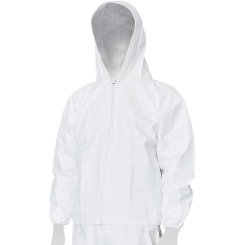 ・使い捨てタイプ・静電気帯電防止加工・耐水性能2000mm以上・袖口ゴム入り・フードひも入り・ポケット付き
