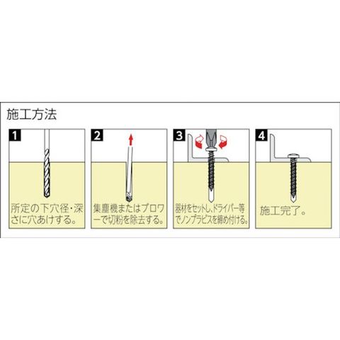 ・呼び径d(mm):4・下穴径(mm):3.5・埋込深さ(mm):30・引張最大荷重(kN):2.5・穿孔深さ(mm):38・長さ(mm):38・適合ドライバー:プラスNo.2・ヘッド形状:ナベ頭・適合材:コンクリート、ブロック