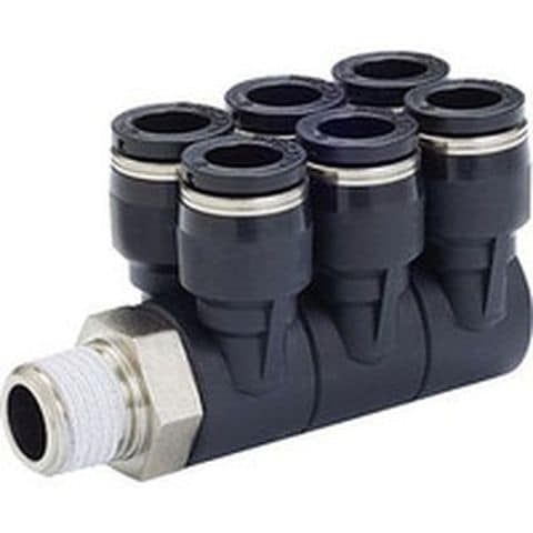 ・適合チューブ外径D(mm):4×4×4×4×4×4・接続口径:R1/4・六角対辺(mm):14・最高使用圧力(MPa):1.0・使用温度範囲(℃):0~60(凍結なきこと)・使用流体:空気、水(条件あり)