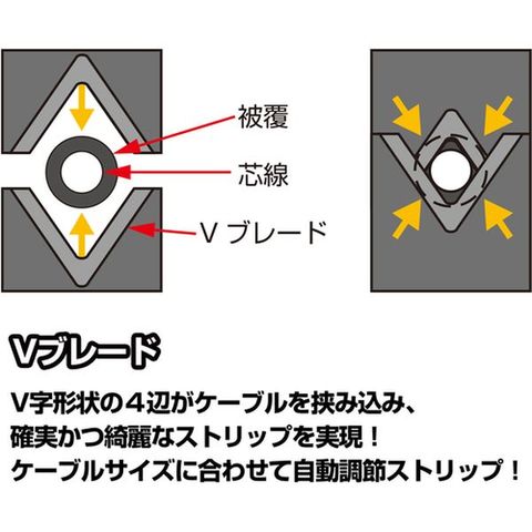 ・V字形状の刃がケーブルを挟み込み、確実かつ綺麗にストリップできます。・電線径自動調整機能でワイヤーサイズを気にすることなくストリップできます。・刃は耐久性に優れた炭素鋼です。・小型・軽量なので使用時の負担を軽減します。