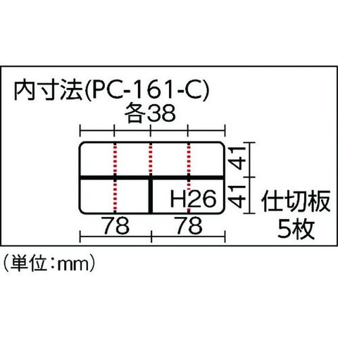 ・色:クリア・外形寸法(mm)間口:165・外形寸法(mm)奥行:95・外形寸法(mm)高さ:30・有効内寸(mm)間口:156・有効内寸(mm)奥行:82・有効内寸(mm)高さ:26・仕切板(枚):5・タイプ:固定・可動仕切