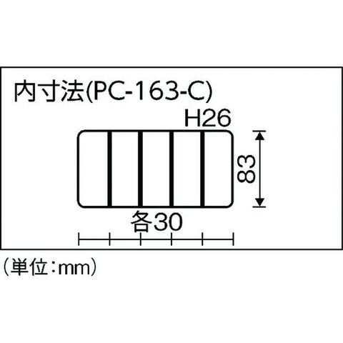 ・色:クリア・外形寸法(mm)間口:165・外形寸法(mm)奥行:95・外形寸法(mm)高さ:30・有効内寸(mm)間口:150・有効内寸(mm)奥行:83・有効内寸(mm)高さ:26・南京錠(別売):取付不可・仕切板(枚):なし・タイプ:固定仕切・コマ数:5