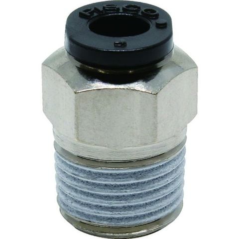 ・適合チューブ外径(mm):4・接続口径:R1/8・六角対辺(mm):10・流体温度(℃):0~60(凍結なきこと)・全長(mm):15.6・使用流体:空気・適合チューブ外径D(mm):4