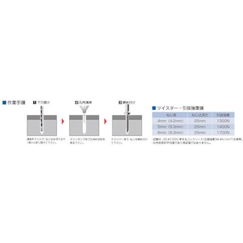 ・埋め込み深さは取付物の厚さ・重量、コンクリートの強度等によって違いますので、用途に合わせてご使用ください。・引抜強度試験は試験材:JIS A1132に準ずるコンクリート圧縮強度34.4N/mm(の2乗)にビスを25mm埋め込み実施。・上記引抜強度値は社内実測の平均値であり保証値ではございません。・注意:大きめの下穴は、引抜強度が低下しますので、ご注意ください。・注意:作業時は切粉が飛散しますので、安全ゴーグルやヘルメット等をご着用ください。