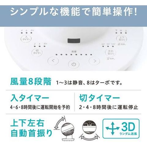 ・風量調整:8段階・首振り:上下左右自動・切りタイマー:2・4・8時間・入りタイマー:4・6・8時間・電源コードの長さ:約1.8m・適用床面積:28畳