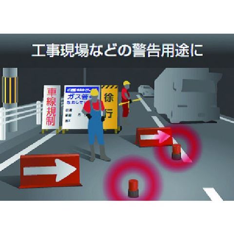 ・レンズ色:赤・色:赤・発光色:赤・幅(mm):101・奥行(mm):101・高さ(mm):160・電源(V):単3電池×4本・保護等級:IP55(正方向)