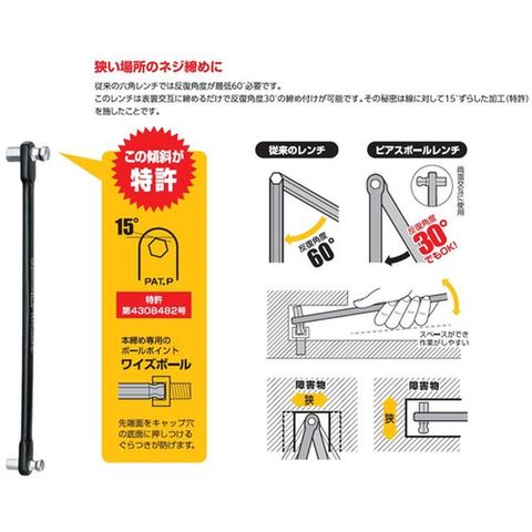 ・軸線に対して15°ずらした加工(特許)を施したことで、表裏交互に締めるだけで反復30°の締め付けが可能です。・2サイズ使える両口タイプです。・打撃ショックにも耐えられるのでサビ付いたねじもはずせます。・上下・左右に障害物のある狭い所でも本締めができます。