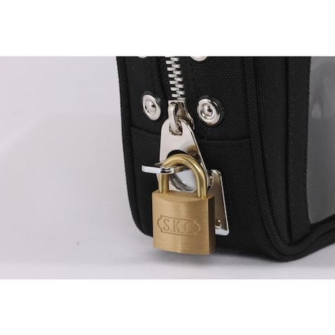・擦り切れに強く、耐久性に優れた帆布生地を使用したポーチです。・南京錠で施錠可能な金具の付いたタイプです。・片面に宅配伝票用透明ポケットが付いているので梱包無しでそのまま配送することができます。・A4用紙サイズまで入れられる大型ポーチです。