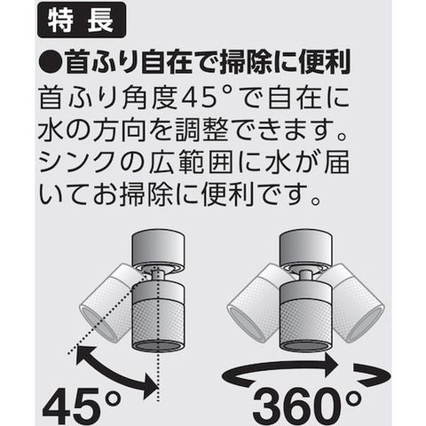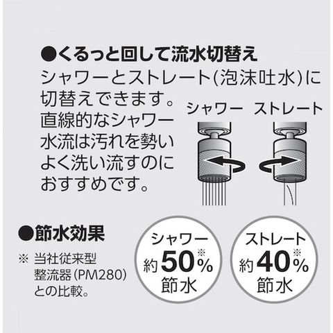 ・切替×首振り自在なキッチンシャワーです。・【首ふり自在で掃除に便利】首ふり角度45°で自在に水の方向を調整できます。・シンクの広範囲に水が届いてお掃除に便利です。・【水流切替可能】シャワー吐水とストレート吐水の切替がくるっと回すだけで簡単に出来ます。・【節水率】シャワー吐水:節水率約50% ストレート吐水:約40% ※当社従来型整流器(PM280)との比較・全長約5.8cmのコンパクトボディなので背の高い鍋やケトルにお水を入れるときにも邪魔になりません。