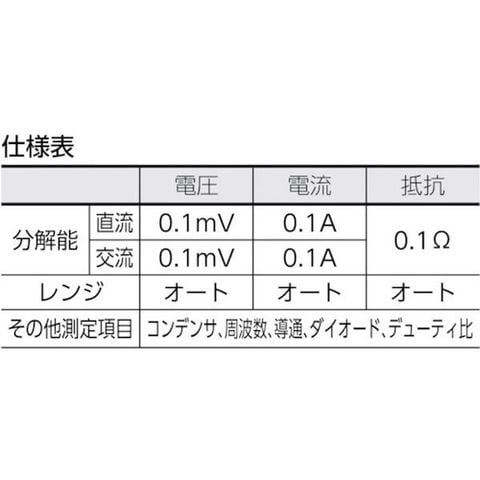 ・直流電圧(V):600・交流電圧(V):600・直流電流(A):100・交流電流(A):100・抵抗(Ω):66M・検波方式:平均値整流(MEAN)・導通チェック:約30Ω未満でブザー音 開放電圧:約1.2V・校正書類:対応可能・電源(V):単4アルカリ乾電池(LR03)×2本(付属)・幅(mm):75・奥行(mm):19.9・高さ(mm):130・電源:単4アルカリ乾電池(LR03)×2本(付属)・幅(mm):75・奥行(mm):19.9・高さ(mm):130・連続使用時間(h):約66・ケース:付・最大表示(カウント):6600・コンデンサ:66mF・ダイオードテスト:開放電圧1.2V・デューティ比:20~80%・周波数:66kHz