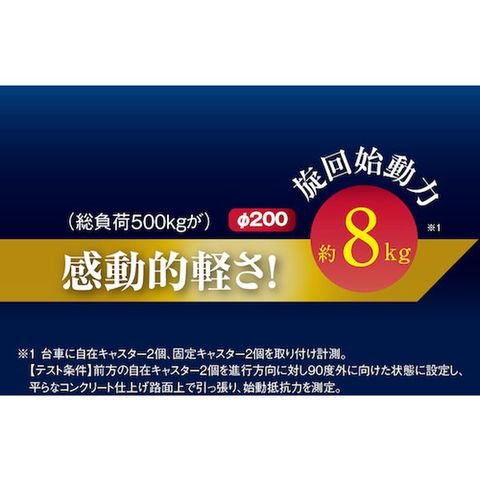 ・旋回始動力が約8KG(総負荷荷重500kg、φ200時)で旋回性能・操作性に優れています。・運搬時に一番重く感じる初期動作を改善するとともに、方向転換時のスムーズな旋回性能を実現しています。・旋回始動性がよく、作業負担を軽減しました。・シミー現象をおさえ、低騒音です。・車輪の摩耗が少なく、長寿命を実現しました。・あっと驚く旋回性能「プレミアムウレタン」総負荷500kgを片手で押せる約17kgを実現(φ150の場合で社内実験による)しました。