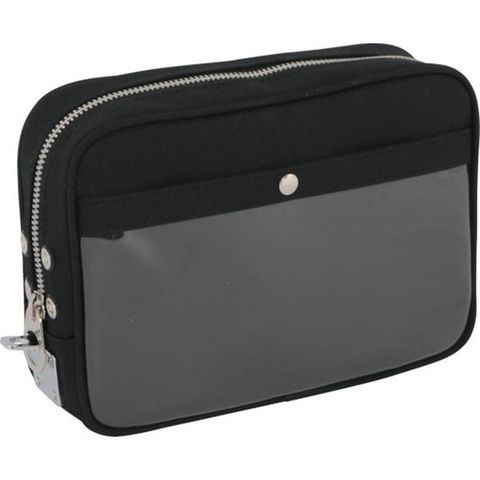 ・擦り切れに強く、耐久性に優れた帆布生地を使用したポーチです。・南京錠で施錠可能な金具の付いたタイプです。・片面に宅配伝票用透明ポケットが付いているので梱包無しでそのまま配送することができます。・A4用紙サイズまで入れられる大型ポーチです。