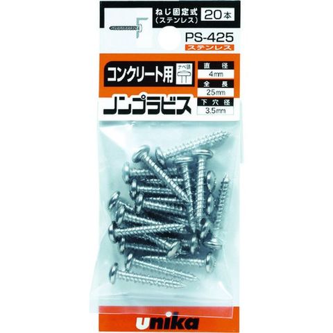 ・呼び径d(mm):4・下穴径(mm):3.5・埋込深さ(mm):20・引張最大荷重(kN):1.5・穿孔深さ(mm):25・長さ(mm):25・適合ドライバー:プラスNo.2・ヘッド形状:ナベ頭・適合材:コンクリート、ブロック