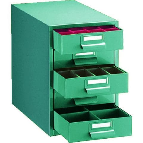 ・間口(mm):233・奥行(mm):410・高さ(mm):348・最大積載量(kg/台):25・色:グリーン・引出し:5段・引出し内プラボックス(個)1段:小32・引出し内プラボックス(個)2段:中16・引出し内プラボックス(個)3段:中16・引出し内プラボックス(個)4段:大8・引出し内プラボックス(個)5段:大8・均等積載量(kg/段):5