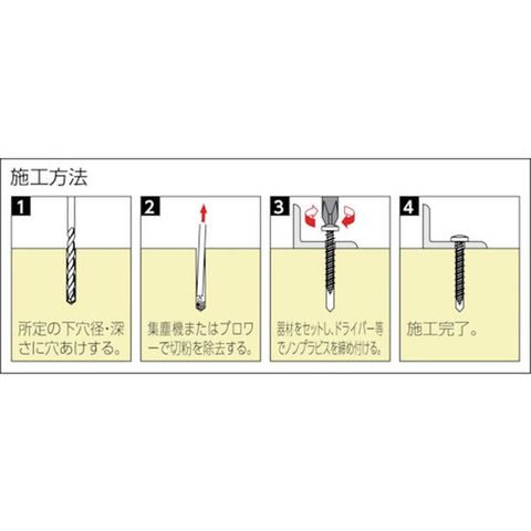 ・呼び径d(mm):4・下穴径(mm):3.5・埋込深さ(mm):20・引張最大荷重(kN):1.5・穿孔深さ(mm):25・長さ(mm):25・適合ドライバー:プラスNo.2・ヘッド形状:座付・適合材:コンクリート、ブロック