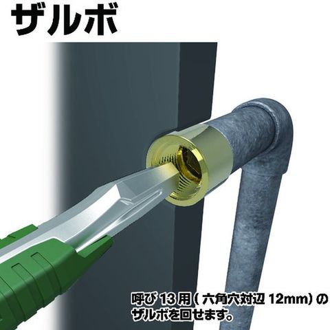 ・対応ねじ(トラス・なべ):φ3~φ5.5・ケレップ着脱:呼び13・ザルボ回し:呼び13(六角対辺12mm)・止水栓ネジ回し(マイナスネジ):-7.8×1mm・パイプ掴み:最大φ41mm