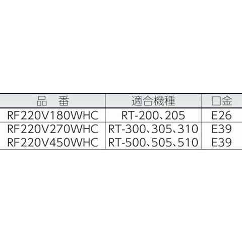 ・RF220Vタイプの替球を、RTタイプの投光器に使用する場合は、プラグ部(コンセント)を220V仕様に変えてご使用ください(RTタイプ投光器の標準仕様に220Vの替球をそのままつけても使用できません)。