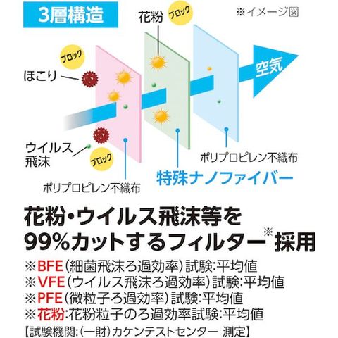 ・本体・フィルター:ポリプロピレン・耳ひも:ポリウレタン・ポリエステル・レーヨン・ノーズフィッター:ポリエチレン