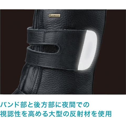 ・世界最高水準の防水浸透素材ゴアテックスファブリクスを使用しました。・耐摩耗性・耐滑性に優れ、屈曲性も高いラバーテックソールです。・バンド部と後方部に夜間での視認性を高める大型の反射材を使用しました。・外側からの水の侵入を防ぎ、汗の水蒸気は素早く放出。靴内をドライで快適に保ちます。