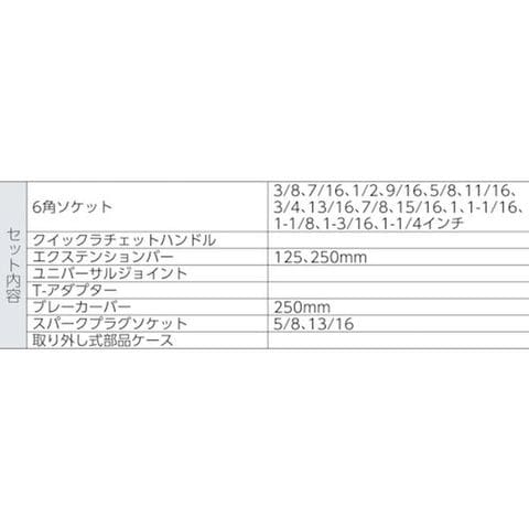 ・6角ソケット: 3/8、 7/16、 1/2、 9/16、 5/8、 11/16、 3/4、 13/16、 7/8、 15/16、 1、 1-1/16、 1-1/8、 1-3/16、 1-1/4各1個・クイックラチェットハンドル1本・エクステンションバー125mm、250mm各1本・ユニバーサルジョイント1個・T-アダプター1個
