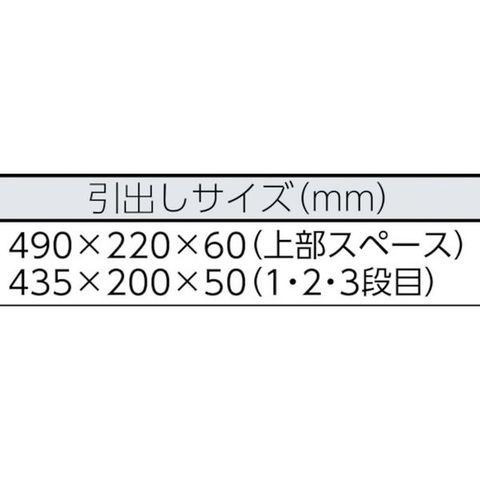 ・上部耐荷重:294N(29.4daN)・引出し耐荷重:245N(24.5daN)・引出しサイズ(上部スペース):490×220×60mm・引出しサイズ(1・2・3段目):435×200×50mm・中皿なし