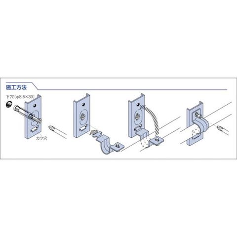・サドル部は蝶番式で1点ビス止め、ベース部も1点アンカー留め、横配管ではパイプが仮置きできます。
