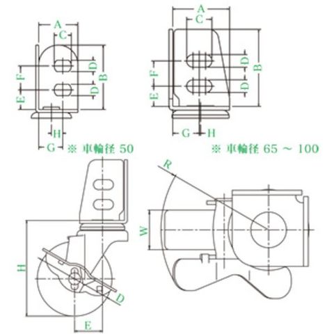 ・車輪径D(mm):75・タイプ:自在式(ストッパー付)・許容荷重(daN):60・許容荷重(kgf):61.2・車輪幅(mm):25・取付高H(mm):96・許容荷重(N):600