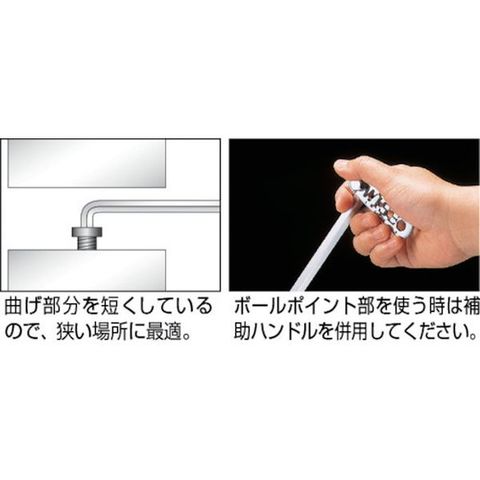 ・特に狭い場所で六角レンチを差し込めるように曲げ部分を短くしてあります。・ボールポイントを使う時は、補助ハンドルの六角穴にレンチ切株部をさしこんでハンドルと延長することができます。・硬度はHRC60±1です。