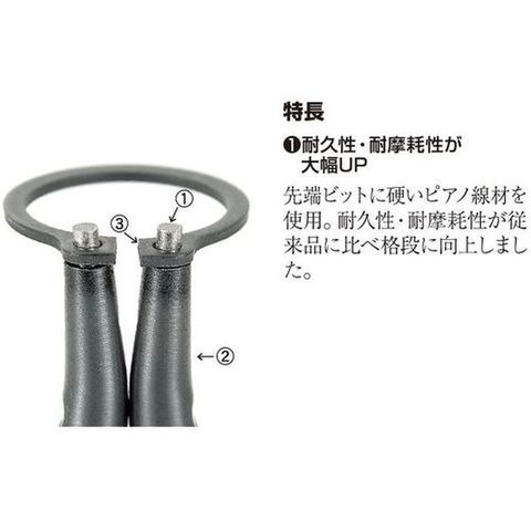 ・先端に硬いピアノ線を使用し、高い耐久性と耐磨耗性を実現しています。・作業中にリングが外れないよう、先端を逆テーパー形状にし、ビットに滑り止め加工を施しています。・取付時にリングがホルダーに密着し固定される為、ガタつかず作業性と安全性が向上します。