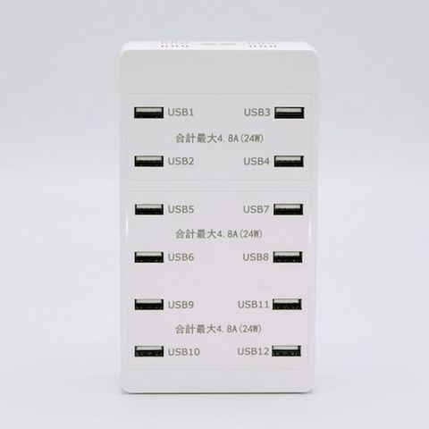 ・電源:AC100V・1ブロック当たりのUSBポート数:4・USB電源出力:DC5V 4.8A(24W)×3ブロック(合計72W)