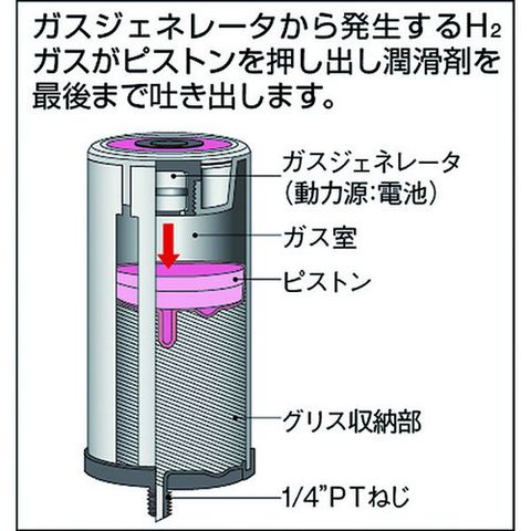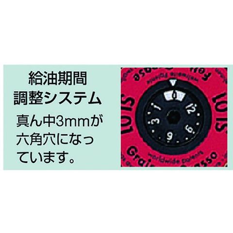 ・グリス容量(cc):125・高さ(mm):118・幅(mm):φ52・設定可能給油期間:1~12ヶ月・グリス吐出期間:1~12ヵ月