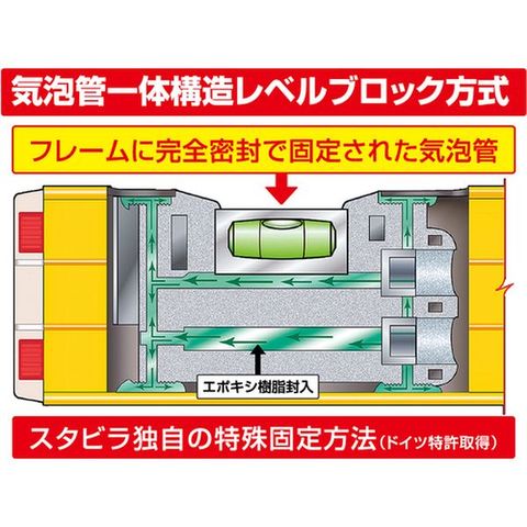 ・両端は耐衝撃性を高めるプラスチックリブ付です。・スタビラ社独自の気泡管完全固定方式のため、狂いにくい構造です。(ドイツ特許取得)・高精度、プロ仕様のアルミレベルです。・300°範囲内から正確に読み取れる気泡管です。・気泡管は移動目視に役立つ3本線付きです。
