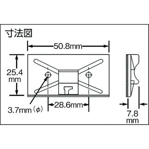 ・色:テレホングレー・縦(mm):50.8・横(mm):25.4・高さ(mm):8.9・使用結束バンド幅(mm):4.8・ねじ穴径(mm):3.7・使用ねじ寸法:M3・最大結束径(mm):使用結束バンドによる・固定方法:粘着テープ(M3ネジ止めも可能)・縦(mm):25.4・横(mm):50.8・高さ(mm):7.8