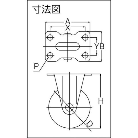 ・車輪径D(mm):100・タイプ:固定式・許容荷重(daN):50・許容荷重(kgf):51・車輪幅(mm):27・取付高H(mm):122・取付座A(mm):100・取付座B(mm):58・取付ピッチX(mm):82・取付ピッチY(mm):40・取付穴径P(mm):8.8・許容荷重(N):500