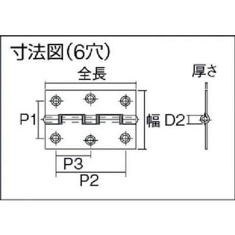 ・全長(mm):76・幅(mm):49・厚さ(mm):1.5・ねじ穴数:6・穴径(mm):5.2・D2(mm):7.5・耐荷重(kg)2個使用時:12・木ねじ入数:24・開き角度(°):300°~330°・表面処理:ヘアライン仕上げ