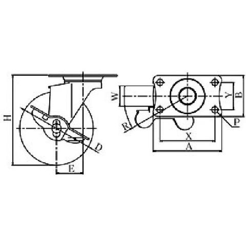 ・車輪径D(mm):50・タイプ:自在式(ストッパー付)・許容荷重(daN):30・許容荷重(kgf):30.6・車輪幅(mm):20・取付高H(mm):65・取付座A(mm):70・取付座B(mm):42・取付ピッチX(mm):56・取付ピッチY(mm):28・取付穴径P(mm):6.5・許容荷重(N):300