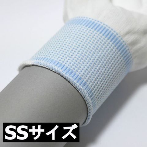 ・色:ホワイト・サイズ:SS・全長(cm):17.5・手のひら周り(cm):8・中指長さ(cm):6.5・厚さ(mm):5・ゲージ数:13・リストカラー:ブルー・滑り止め:白