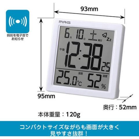 ・電子音アラーム、スヌーズ、タッチセンサーライト、カレンダー表示、温度/湿度表示、12/24時間表示
